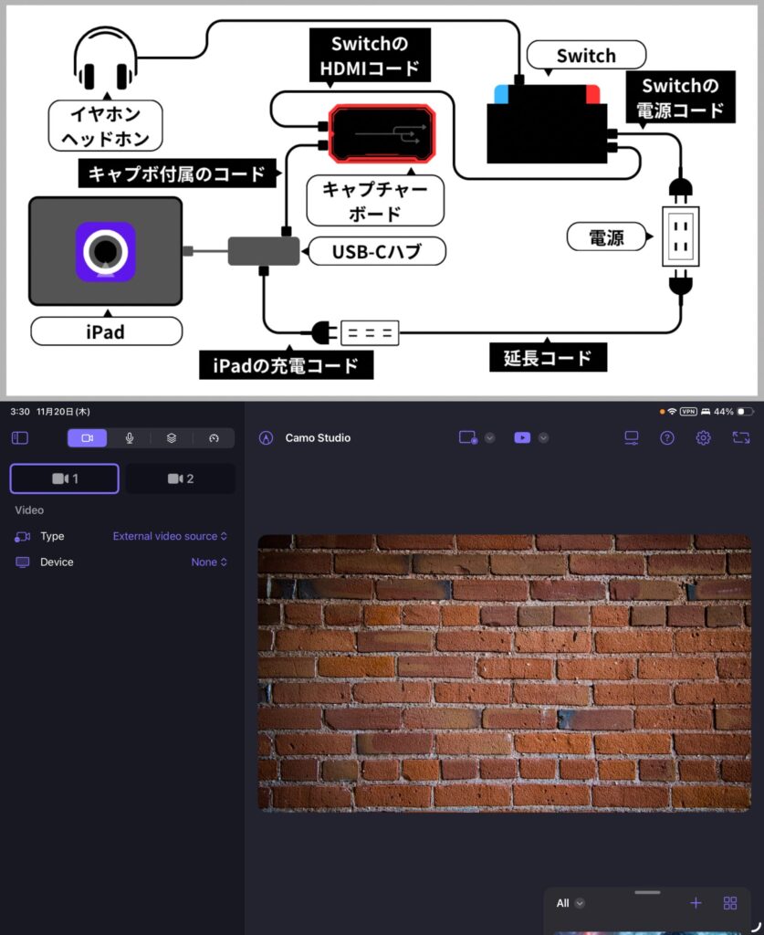 iPad上にある紫のものはSwitchの映像をiPadに映すためのアプリ「Camo Studio – Stream & Record」です。
