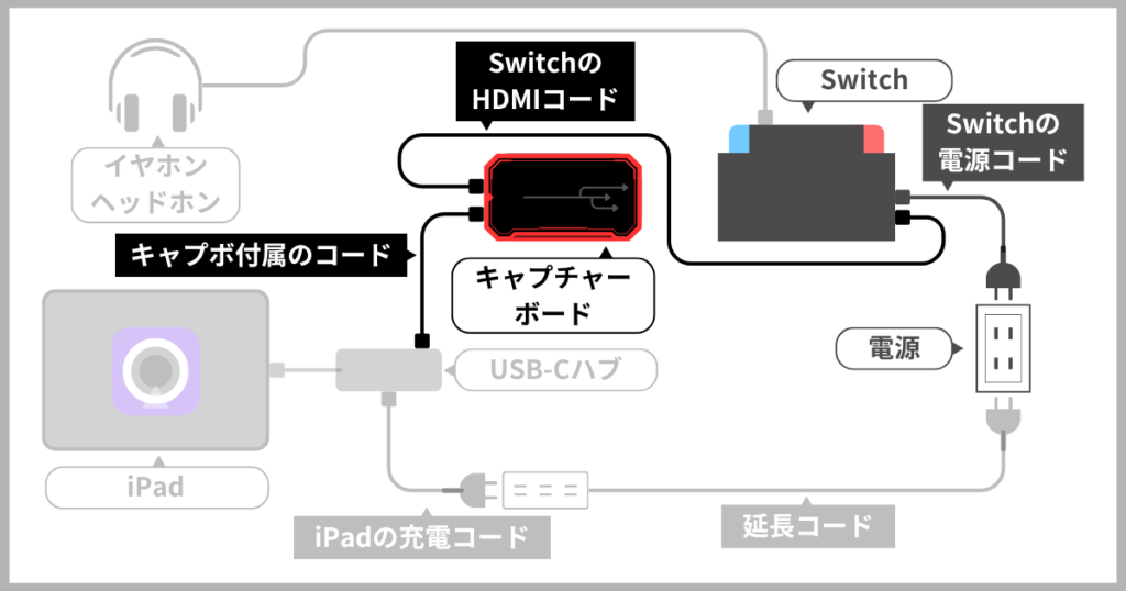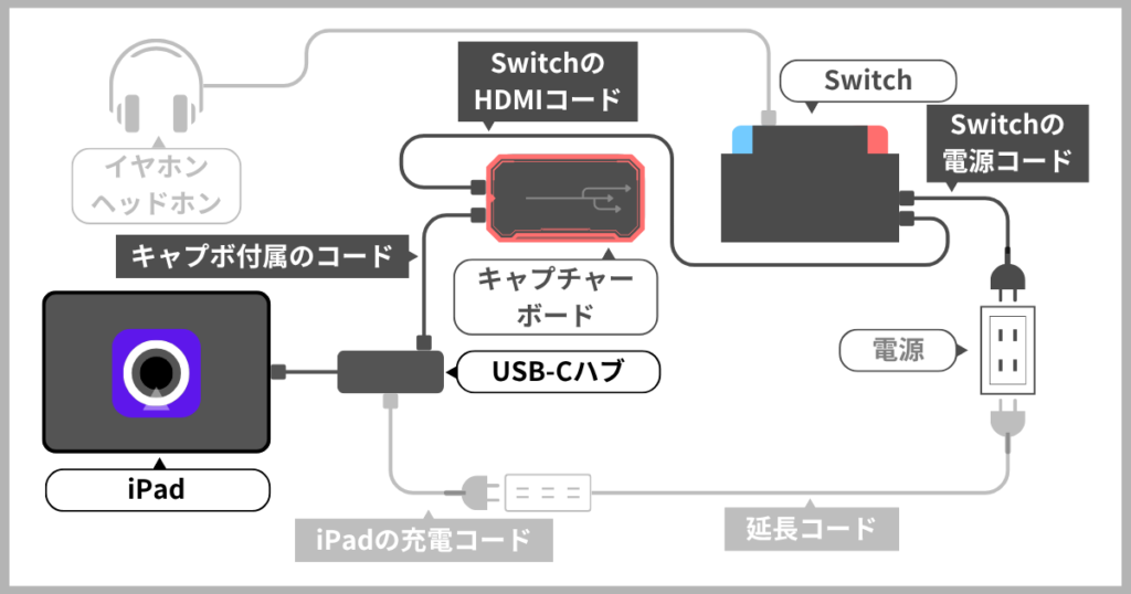 - HDMI→TypeCに変換するケーブル(ゲーム映像をiPadに映せる形に変換する道具)