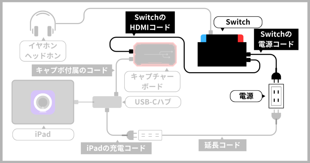 設置場所によってはSwitchの電源コードが電源に届かないと思います。その際はiPadの充電コードと一緒に図面下部の延長コードに挿しましょう。